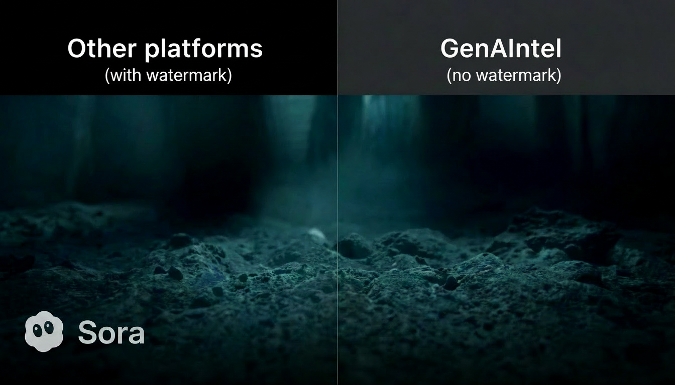 Use GenAIntel to choose a watermark-free export model from the start—or use Sora 2 to develop the shot, then re-render the final output on a watermark-free model for delivery.
